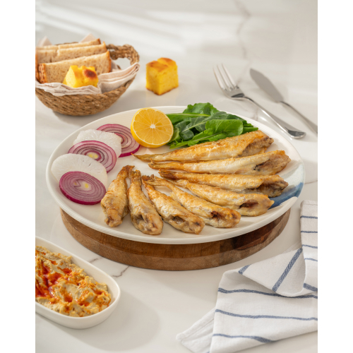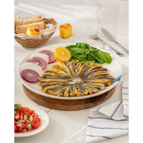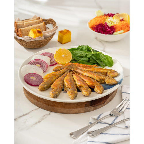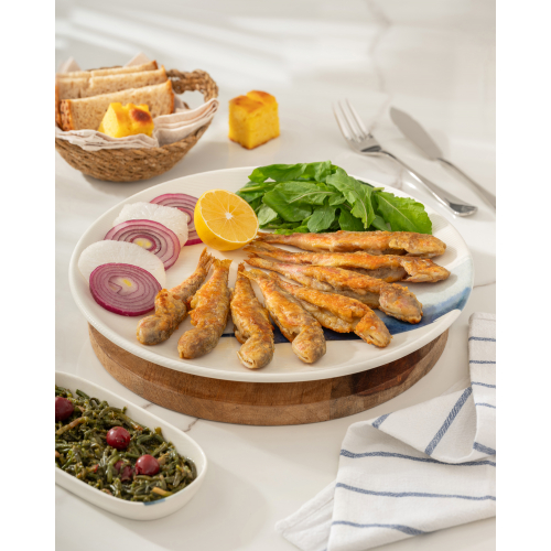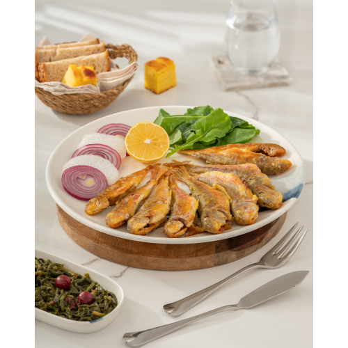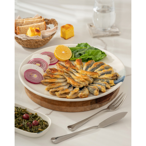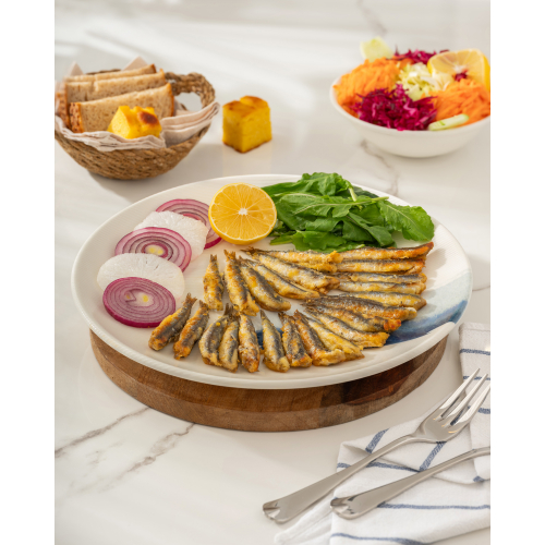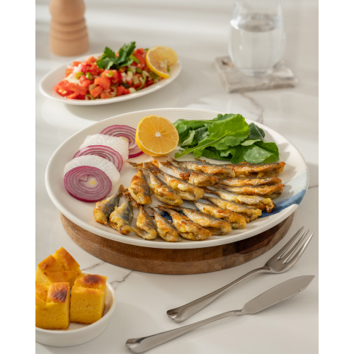 İstavrit, mısır unu, ayçiçeği yağı, roka, soğan, l...