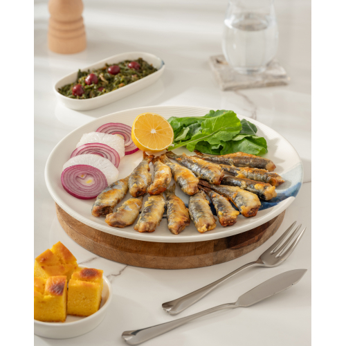Hamsi, roka, mısır unu, soğan, limon, ayçiçeği yağ...